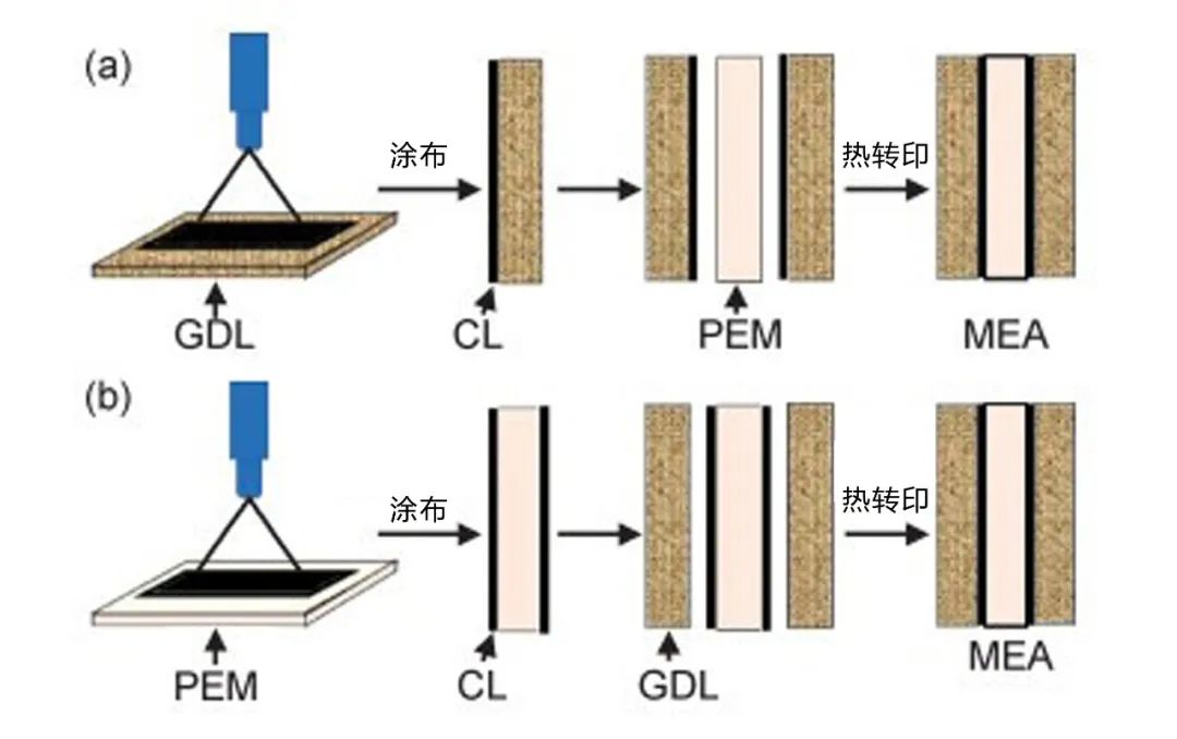 該方法需配合刮刀涂布技術(shù),將催化劑漿料負(fù)載于貼花基材上,然后通過熱轉(zhuǎn)印后轉(zhuǎn)移至質(zhì)子交換膜上。