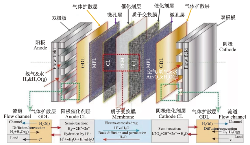 催化層是電極反應(yīng)進(jìn)行的最主要場所,由催化劑及載體和離聚物組成,主要作用是用來加快H2和02的反應(yīng)速率,理想的催化層是電導(dǎo)率、質(zhì)子電導(dǎo)率、氣態(tài)反應(yīng)物傳輸和催化劑可及性之間的優(yōu)化平衡。