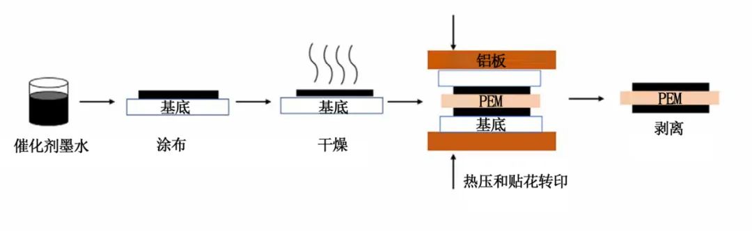 該方法需配合刮刀涂布技術(shù),將催化劑漿料負(fù)載于貼花基材上,然后通過熱轉(zhuǎn)印后轉(zhuǎn)移至質(zhì)子交換膜上。